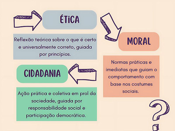 A moral, por sua vez, está mais diretamente relacionada às normas culturais e sociais que regulam o comportamento dentro de um grupo específico, sendo frequentemente mais rígida e prática em sua aplicação. Quando a cidadania, integra esses valores, direciona-os para a ação coletiva, envolvendo o indivíduo em um contexto mais amplo de participação social e política, buscando sempre o bem comum.