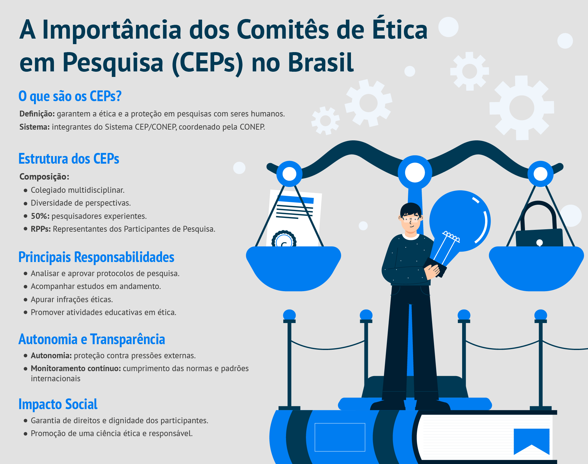 O infográfico a seguir destaca o papel essencial dos CEPs na proteção da ética e dos direitos em pesquisas envolvendo seres humanos. Estruturados como colegiados multidisciplinares, com 50% de pesquisadores experientes e representantes dos participantes de pesquisa (RPPs), os CEPs integram o Sistema CEP/CONEP, coordenado pela CONEP. Entre suas principais responsabilidades, estão a análise e aprovação de protocolos de pesquisa, o acompanhamento de estudos em andamento, a apuração de infrações éticas e a promoção de atividades educativas sobre ética. Valorizando a autonomia e transparência, os CEPs garantem proteção contra pressões externas e monitoram o cumprimento de normas internacionais, contribuindo para uma ciência ética, responsável e que respeite a dignidade dos participantes.