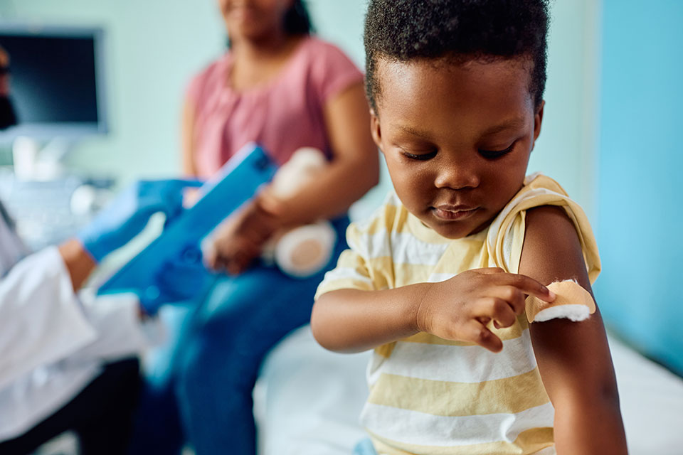 Figura 3: Criança com olhando para seu braço com esparadrapo após vacinação. Fonte: Envato.