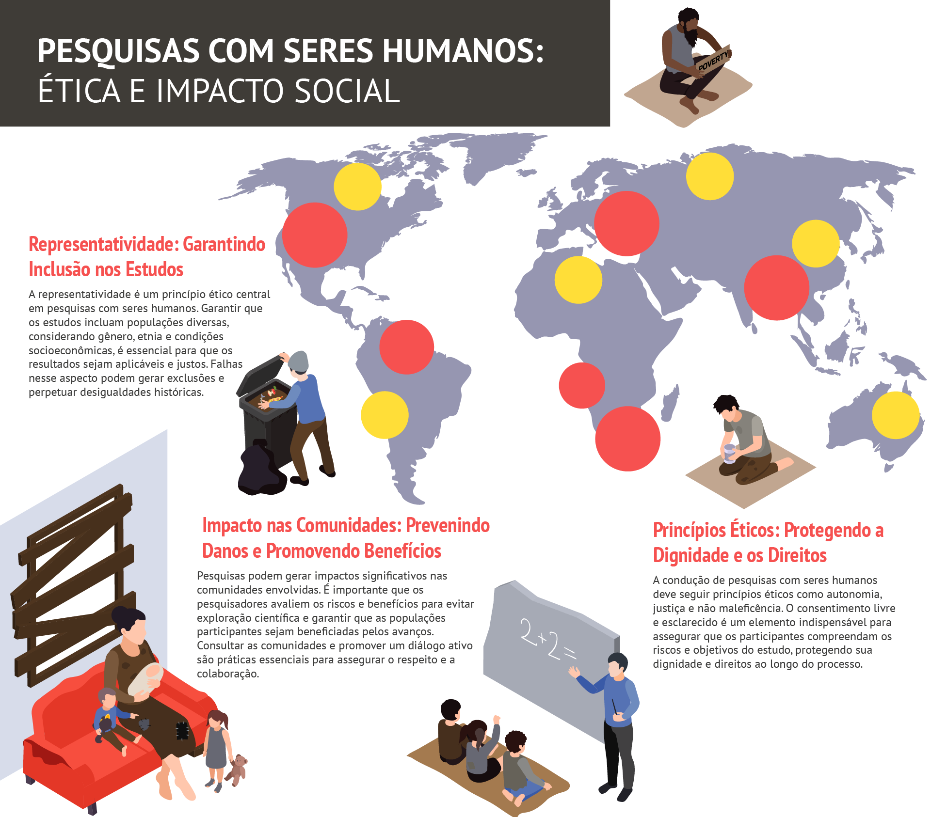 Neste infográfico, exploraremos os dilemas éticos das pesquisas com seres humanos, destacando os desafios enfrentados por pesquisadores em contextos de vulnerabilidade social e desigualdade. Abordaremos aspectos como representatividade, impacto nas comunidades locais e os princípios éticos que devem guiar as decisões.